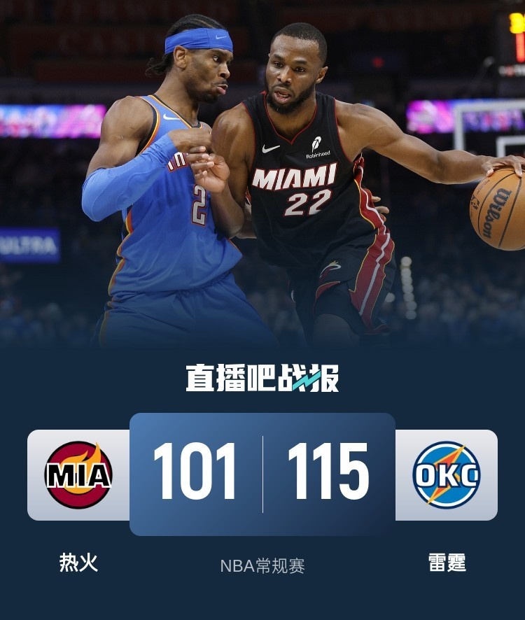 比赛开始,阿德巴约里突外投带领热火打得很主动,并迅速建立双位数领先,亚历山大手感不佳,强突2+1终于开和,但热火其他人多点开花首节领先12分,次节雷霆进攻端还是不顺,热火全民皆兵直接拉开20分以上领先,雷霆7-0止血,亚历山大压哨三分追到差11分。下半场,双方展开拉锯战,杰伦威接连突破几度追到个位数分差,但约维奇接连三分能回应,三节热火还领先10分,末节亚历山大带领雷霆接连外线三分,轰出24-0超级攻击波直接反超并领先到双位数,阿德巴约和维金斯接连三分止血,但随后又是突然断电单节仅得8分,雷霆保持住10分左右领先,最终雷霆115-101,21分大逆转热火,拿到7连胜同时送对手3连败。