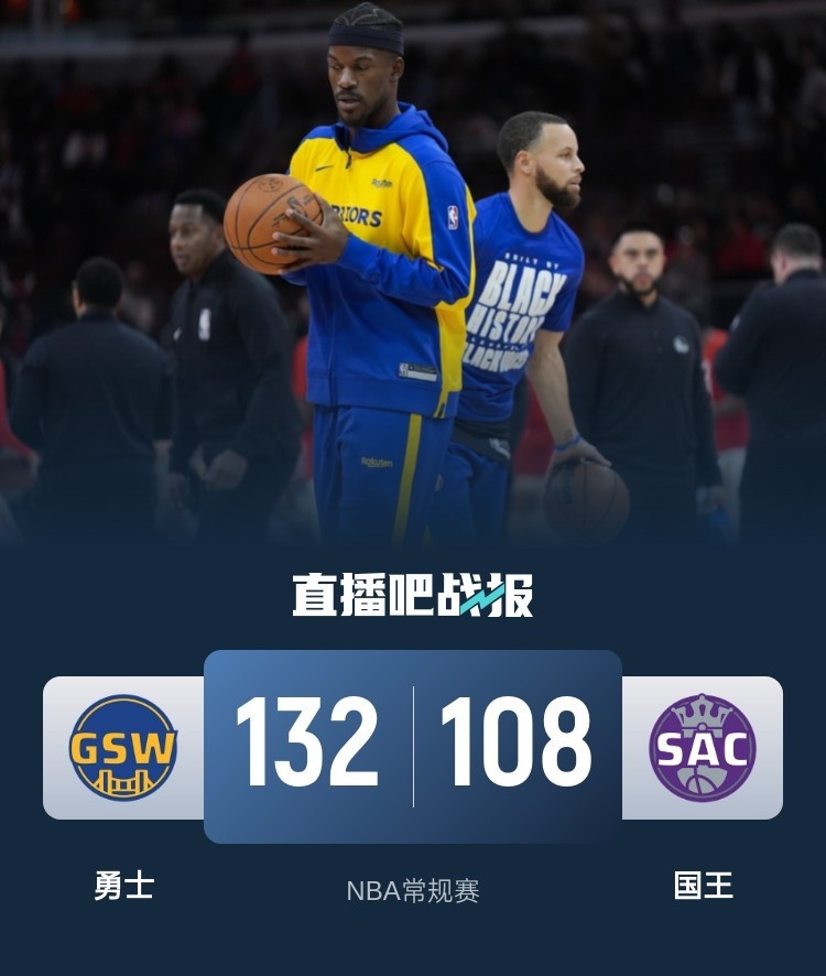 比赛开始,双方开场势均力敌,比分交替领先,次节勇士外线开火,连中三分取得两位数领先,德罗赞内外开花苦苦追赶,勇士多点开花不断扩大优势,半场战罢勇士68-53领先国王。易边再战,国王率先发力迫近比分,勇士回敬18-6的攻击波一举获得20分优势,富尔茨连续拿分止血,末节勇士稳扎稳打保持优势,没有给对手反扑的机会,最终,勇士客场132-106击败国王,结束了对对手的5连败,也赢得了关键的卡位战。