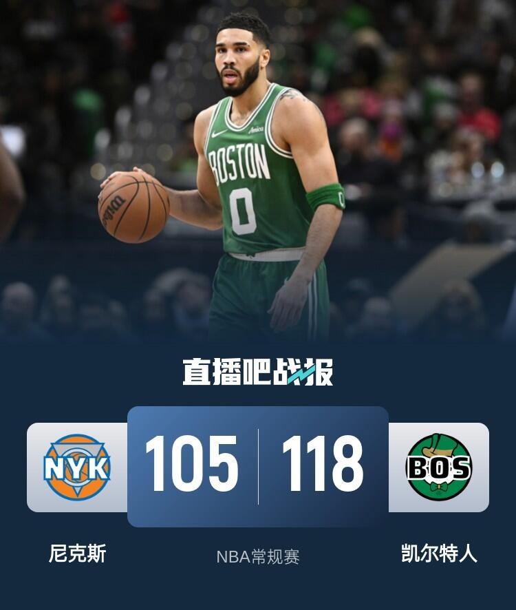 比赛开始,绿军先发五虎都得分带队打出13-3不错开局,哈特和布伦森接连单打止血,但豪泽连续外线发炮,塔图姆接连突破还是领先到19分,次节佩恩连砍7分助队10-2迅速追分,波尔津吉斯攻防建功助队稳住局势,塔图姆干拔三分再中助绿军半场领先21分。下半场,唐斯反弹里突外投得分迅速上双,但双探花外线能回应,布伦森连砍12分助队打出23-5攻击波一度追到个位数分差,末节怀特接连三分助队稳住局势,唐斯受伤好在无碍,杰伦-布朗发力连砍11分带队重新拉开20分领先,最终凯尔特人118-105击退尼克斯,拿到5连胜。