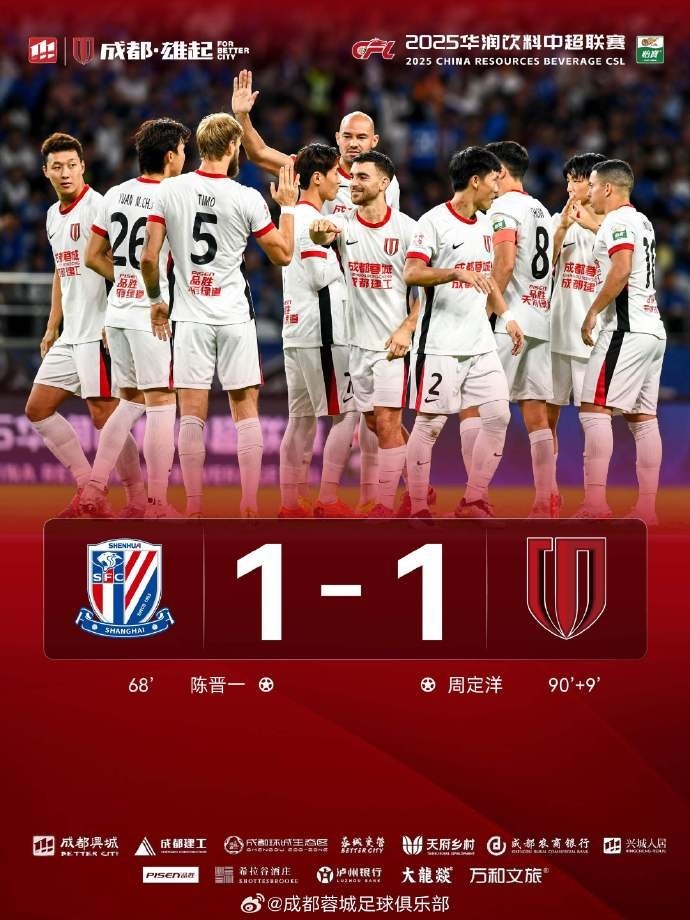 中超联赛第25轮,成都蓉城1-1战平上海申花,在客场拿下关键1分!