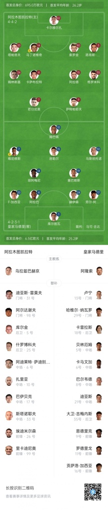 皇马首发:1-库尔图瓦、17-劳尔·阿森西奥、24-赫伊森、4-阿拉巴、20-弗兰·加西亚、14-琼阿梅尼、19-塞巴略斯、15-居勒尔、30-马斯坦托诺、7-维尼修斯、10-姆巴佩