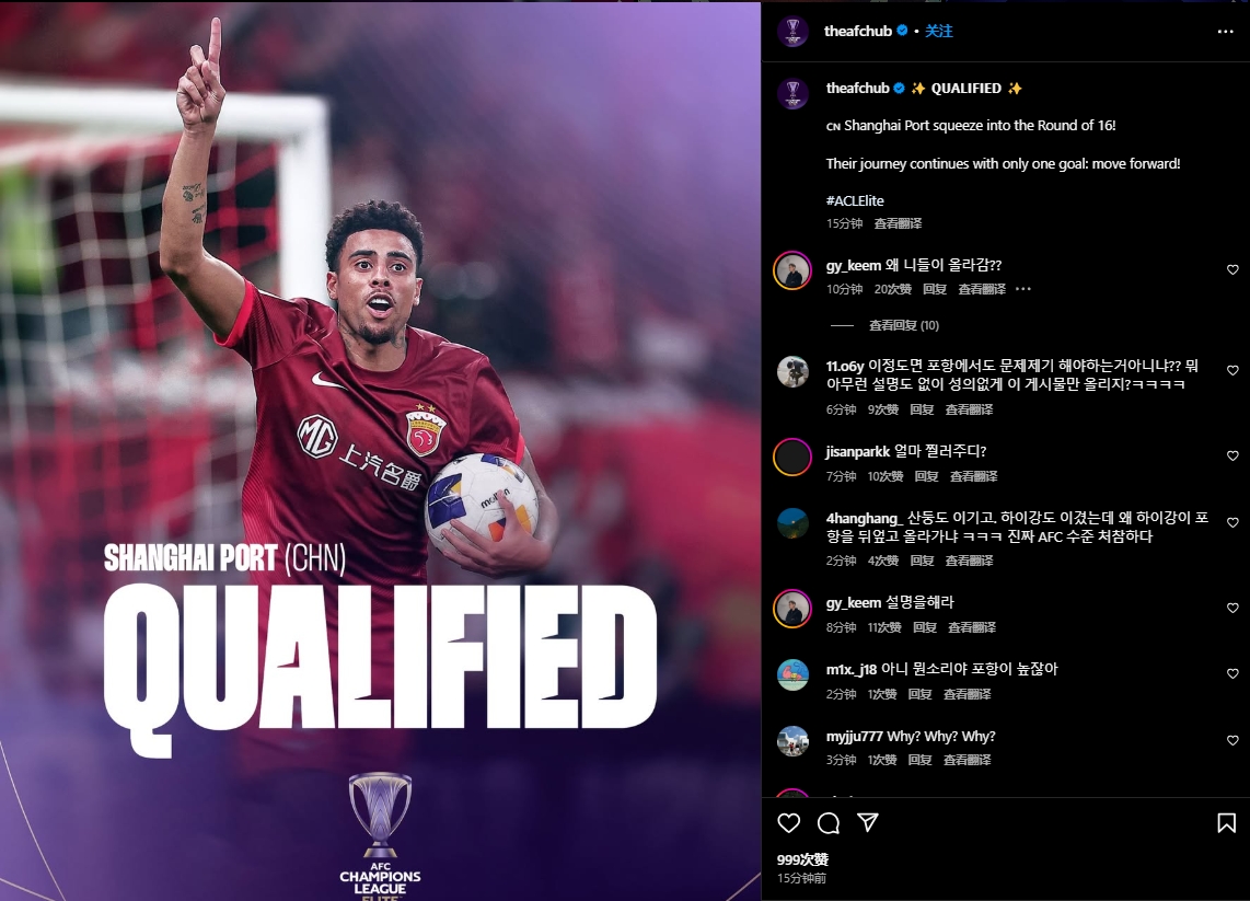 亚足联官方社媒ins账号发布了海港晋级的海报,但评论区遭到韩国球迷批评,因为韩国球队浦项制铁原本有机会出线,但由于现有规则球队在泰山身上拿的3分被扣除,球队可能无缘晋级。