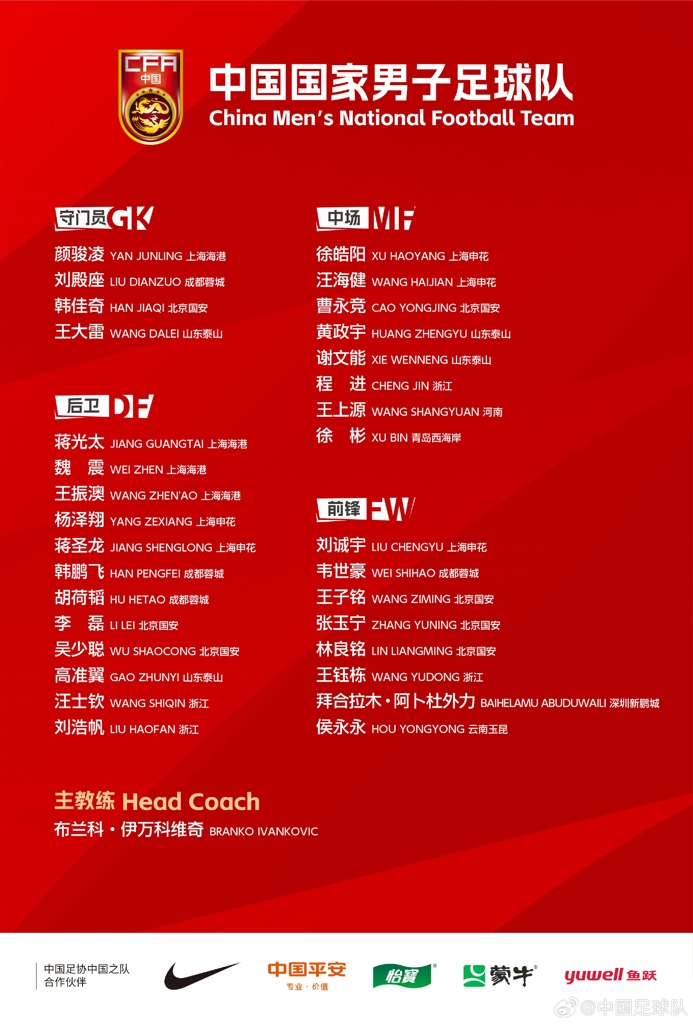 后卫:蒋光太回归、王振澳、汪士钦、刘浩帆入选、朱辰杰因伤缺阵、吾米提江落选